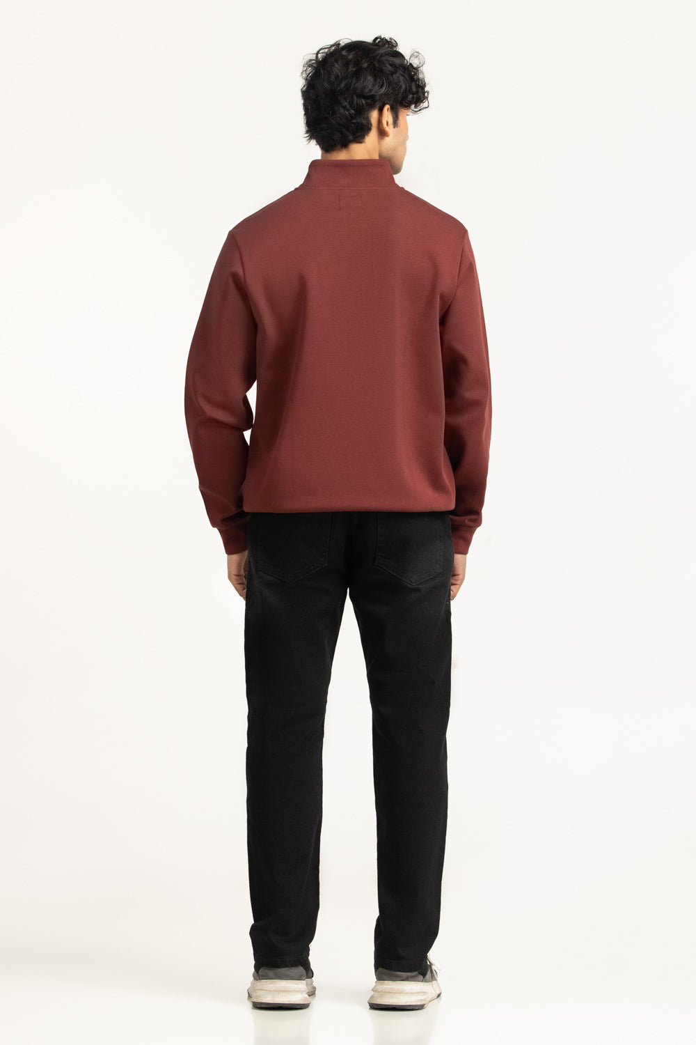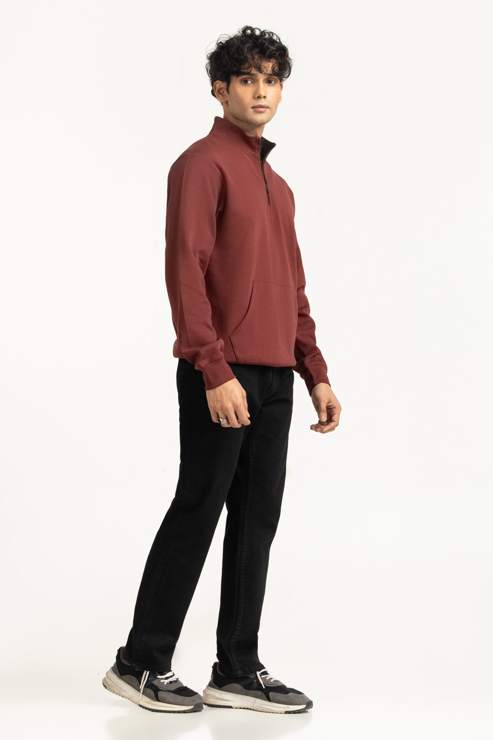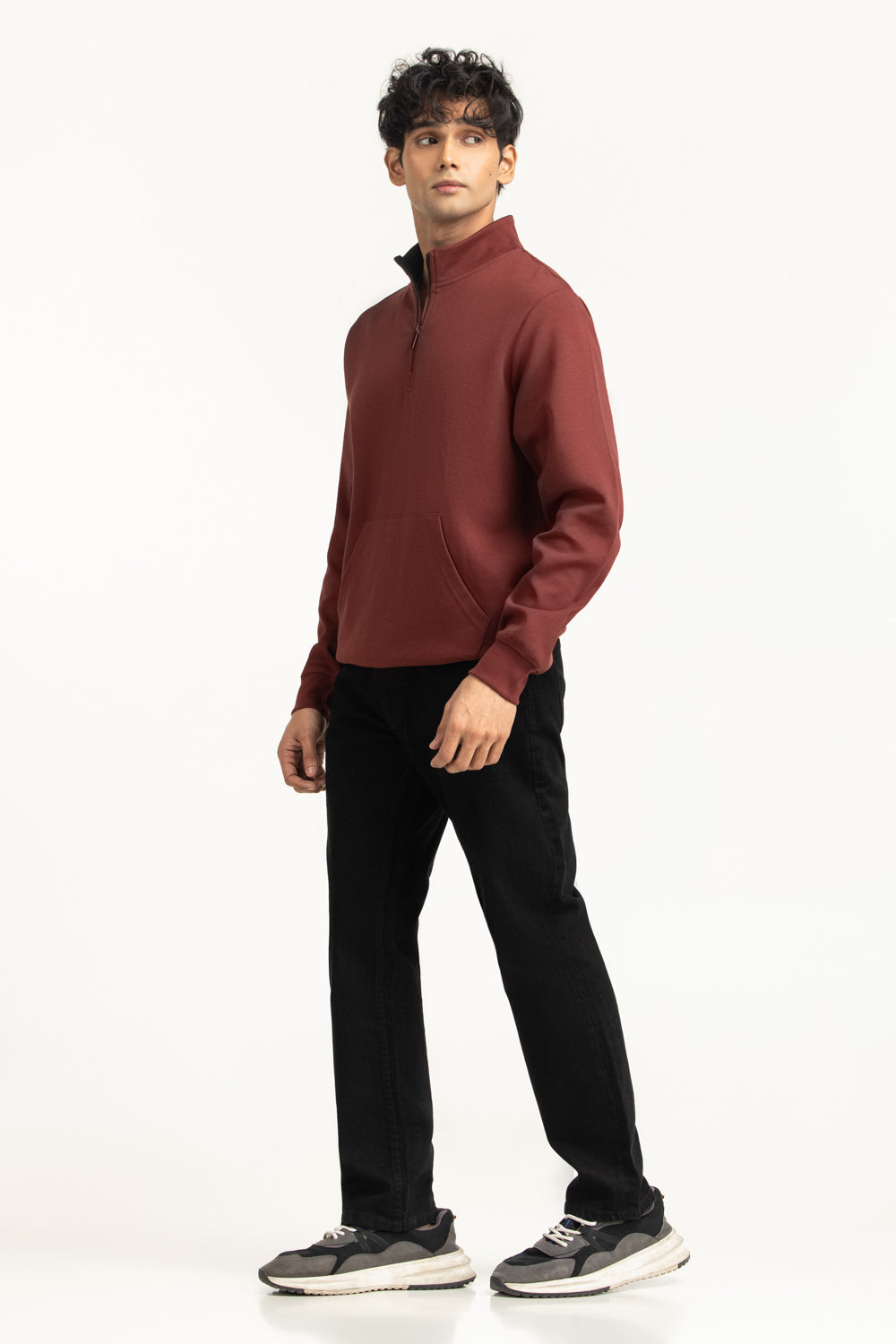 Bold red hue with a zipper neckline and a kangaroo pocket, exudes warmth while keeping comfort at the center. The knitted texture and regular fit silhouette provides a soft feel for effortless styling.