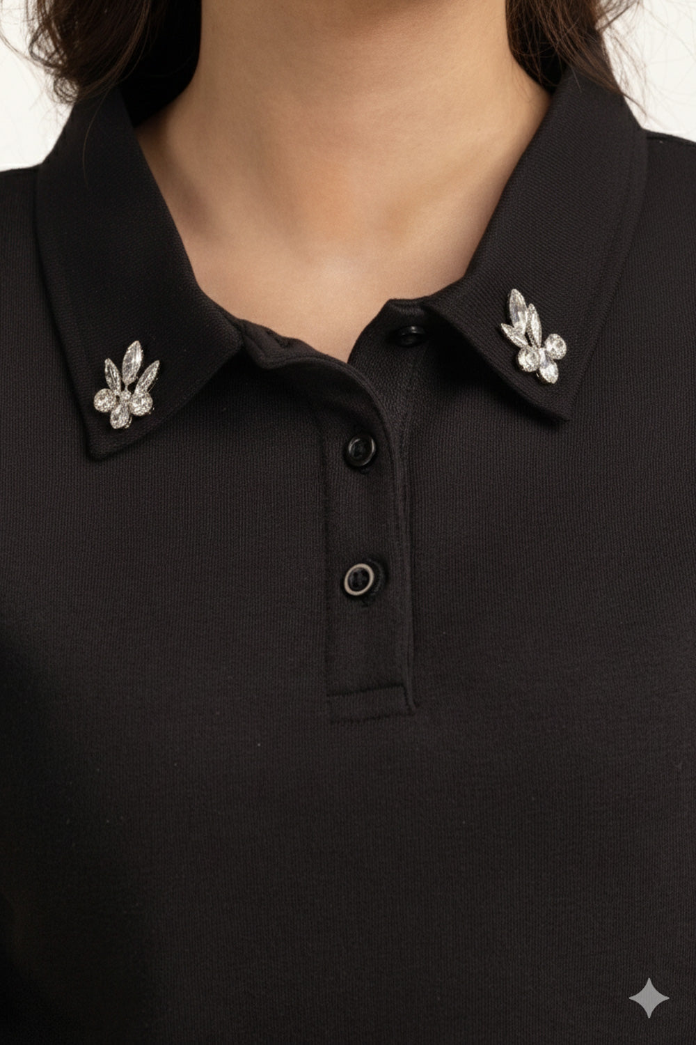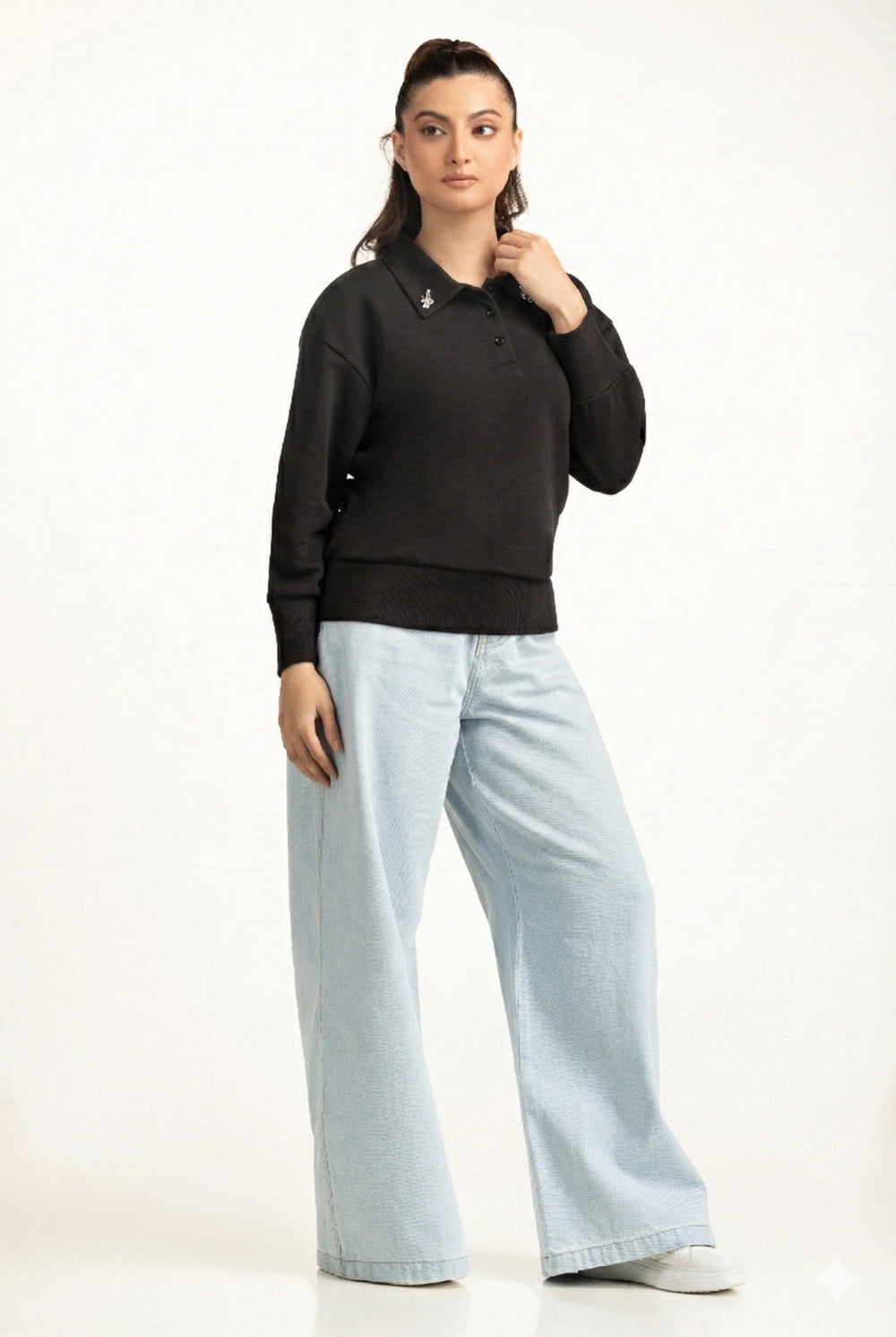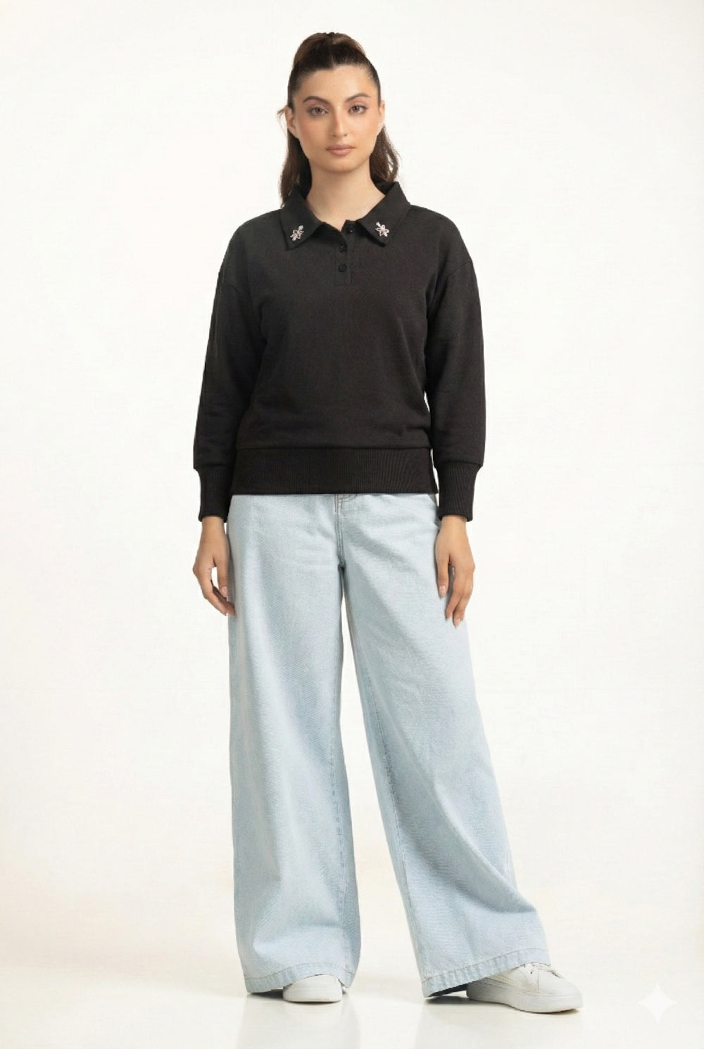 This black sweatshirt brings a polished winter charm with its soft-touch fabric that keeps you warm without the weight. The embellished collar adds a quiet sparkle, giving your everyday style a refined, youthful edge.