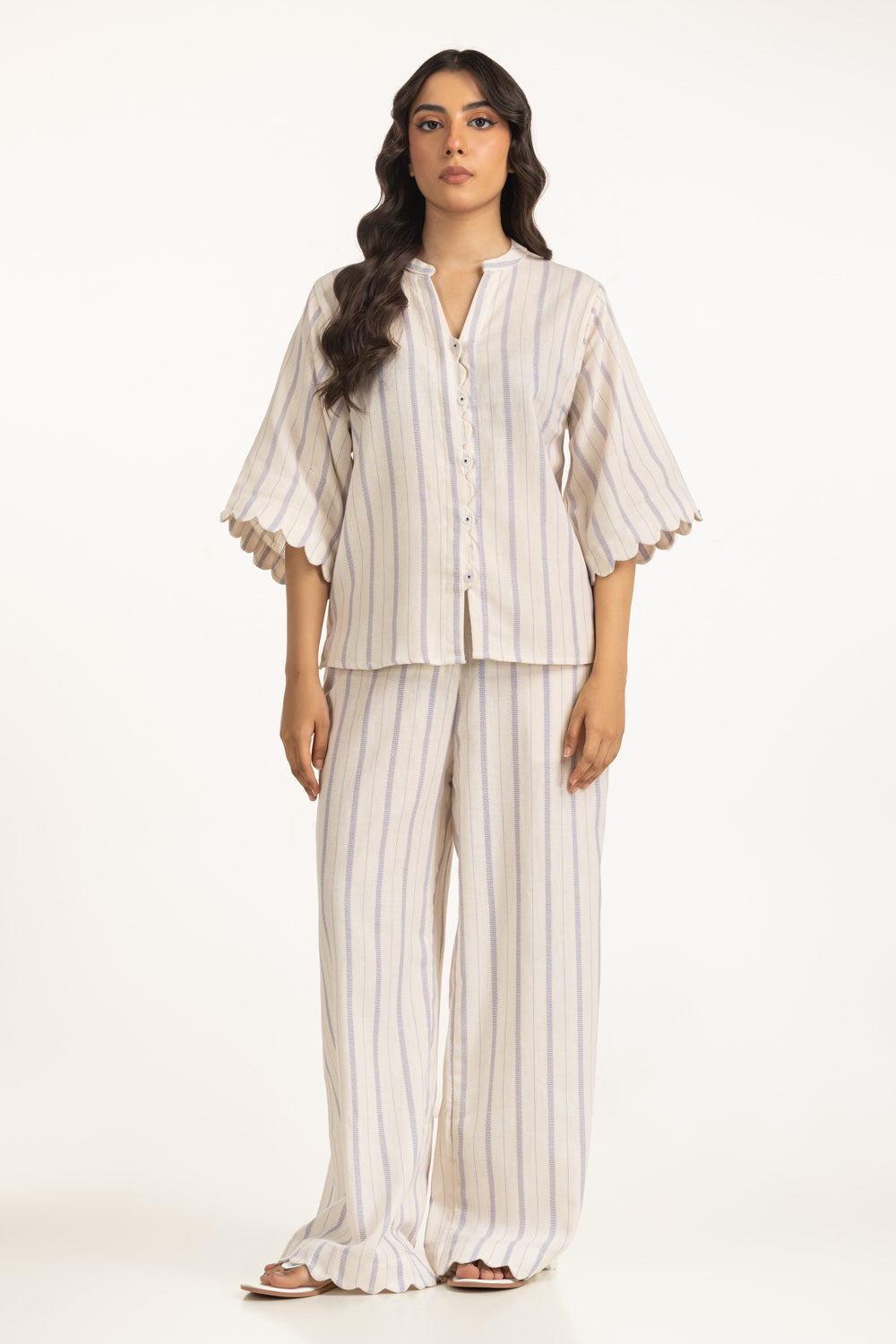 Made in pure cotton fabric with refreshing lilac stripes, this button-down top capture the essence of laid-back elegance. Its structured yet breathable silhouette keeps you poised through long summer hours. Pair with the coordinated bottoms for a sleek, effortless look.