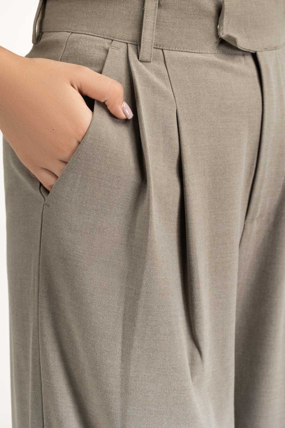 A winter-ready trouser shaped in regular fit silhouette with structured pleats to offer comfort and style. The grey hue with blended fabric provides a polished look. Pair with the matching top for a coordinated chic look.