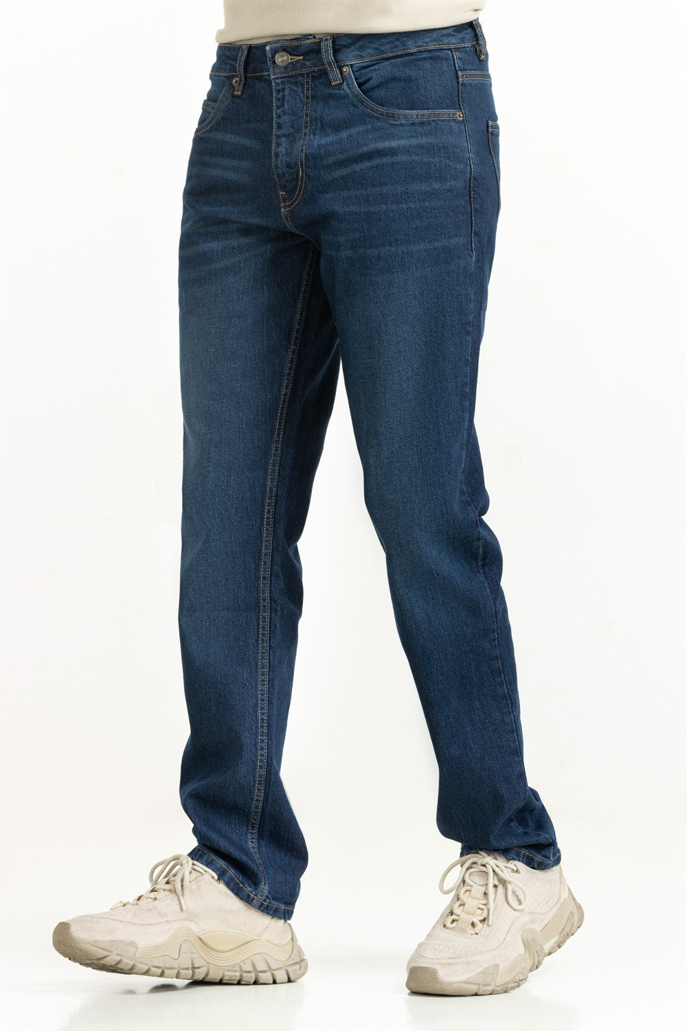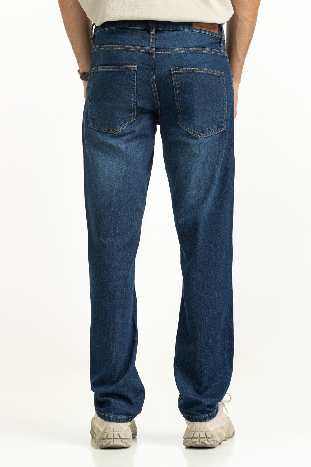 The classic straight fit jeans, crafted in a deep blue hue balances structure and comfort effortlessly. Its cotton construction enhances all day comfort while exuding a chic timeless look throughout summer.