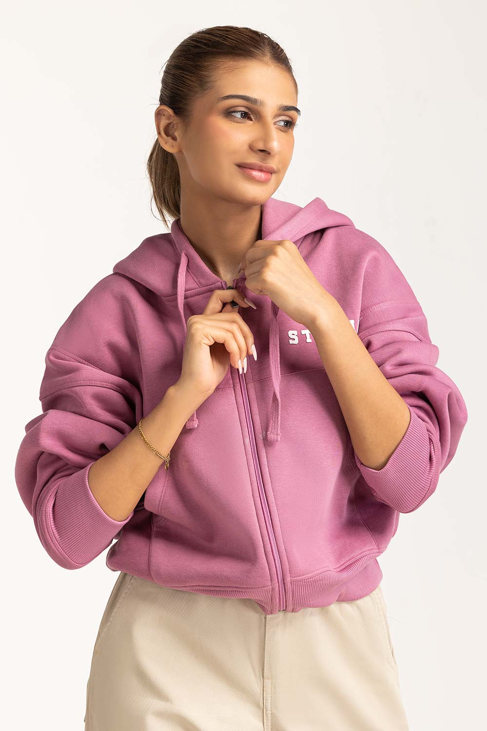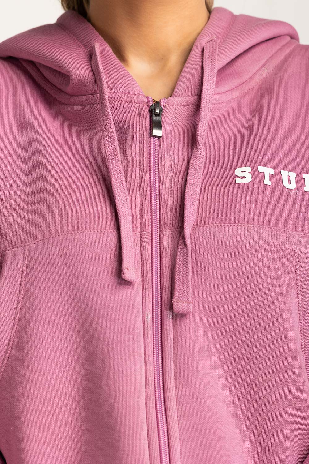 Pink Oversized Zipper Hoodie with Drop Shoulder Loose Fit Model height is 5' 6". Model is wearing...